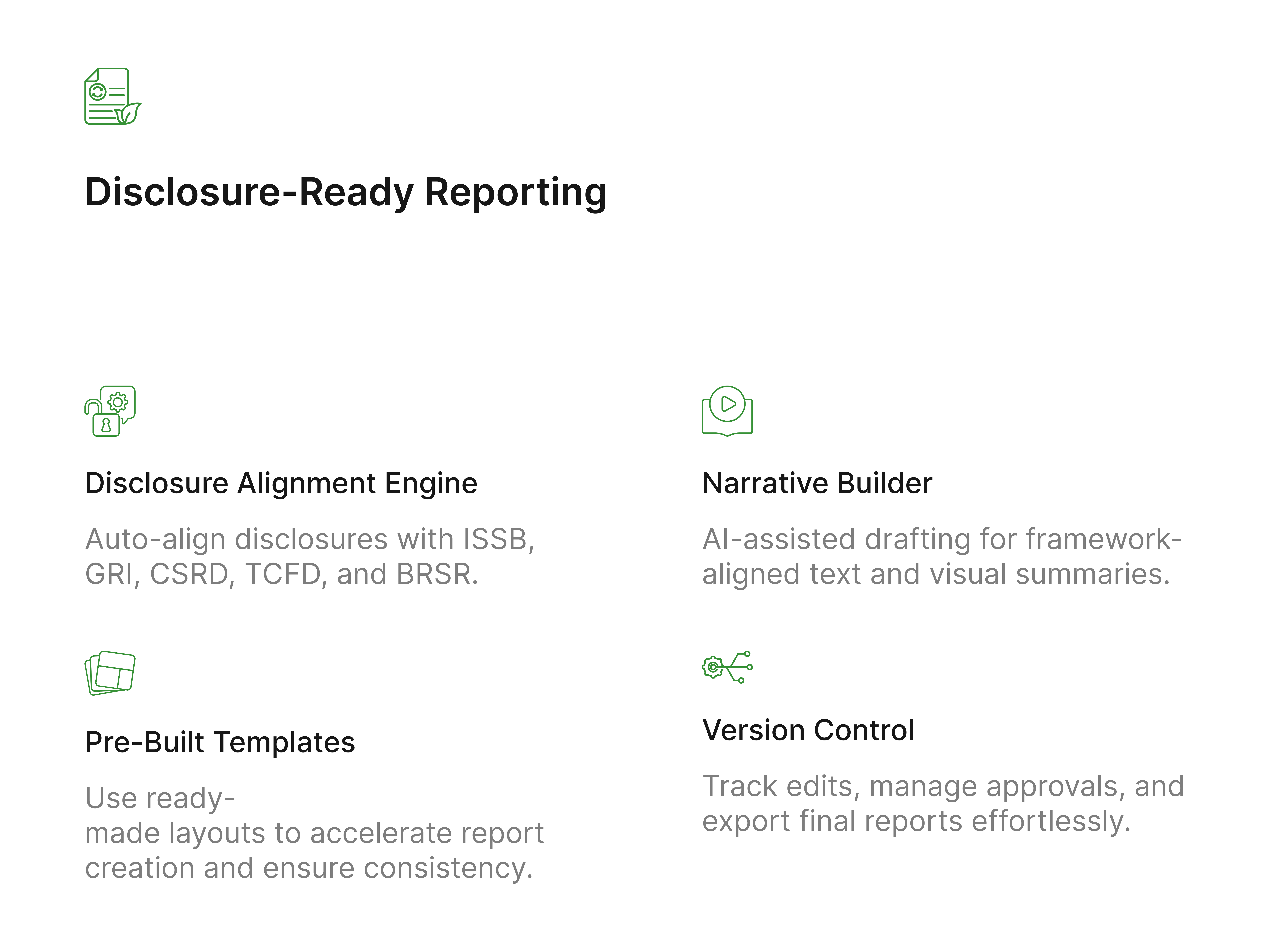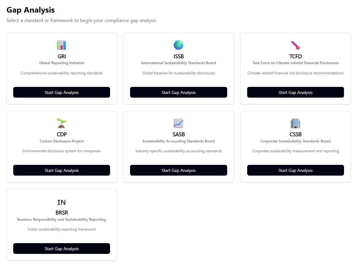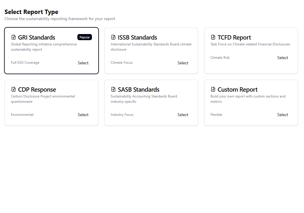 Generate disclosure-ready sustainability reports aligned with GRI, ISSB, CSRD, TCFD and BRSR frameworks.